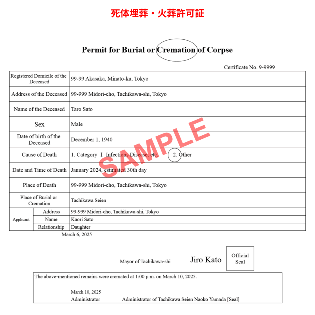 以下は死体埋葬・火葬許可証の英語翻訳サンプルです。