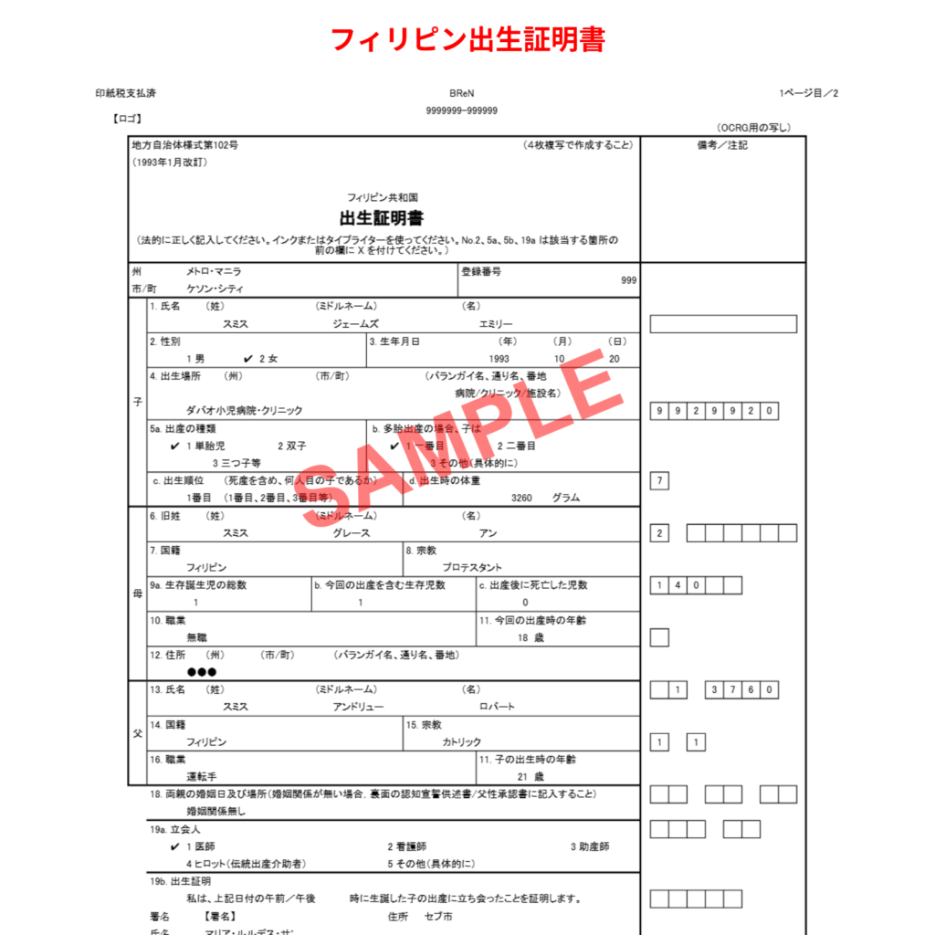 以下フィリピン出生証明書の日本語翻訳サンプルです。